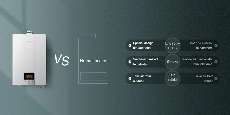 Un calentador de agua de gas de tiro forzado utiliza un ventilador para agotar los gases de combustión del exterior. Requiere una bomba de escape conectada al exterior. En contraste, un calentador de agua de gas de tipo equilibrio tiene una cámara de combustión sellada. Atrae el aire exterior para la combustión y agota los gases afuera a través de un chimenea coaxial. Esto lo hace más seguro para la instalación en áreas con ventilación limitada, ya que no consume aire interior para la combustión.