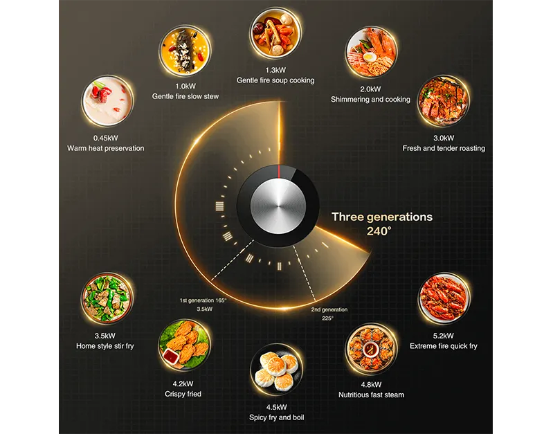 Aumente el rango ajustable de 75 ° para lograr un ajuste fino de 0.45-5.2kW. Control de incendios preciso de nivel de chef de estrella profesional, y se pueden cocinar varias recetas a voluntad.