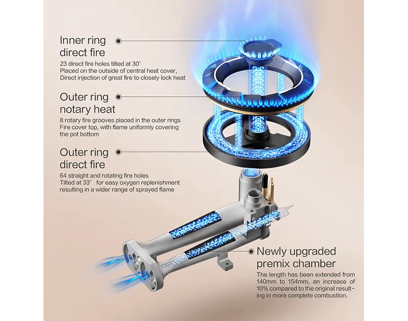 El quemador de recolección de llama uniforme recién mejorado presenta un anillo interno que se calienta a una velocidad rápida de fuego directo, un anillo exterior que gira y estabiliza la llama, y un anillo exterior que estabiliza la llama a una velocidad más rápida de fuego directo.
