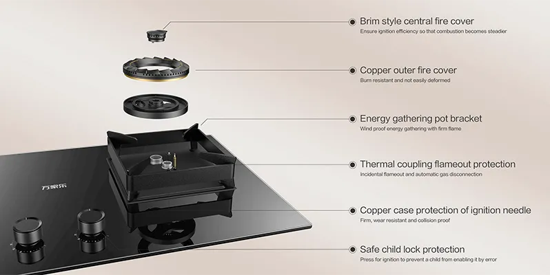 Esta estufa de gas combina diseño y funcionalidad premium para experiencias de cocina elevadas. Con una tapa de quemador de latón y un quemador de tipo X con cubierta de fuego decorativo de la escalera de espiral dorada, asegura incluso la distribución del calor y agrega un toque de elegancia. El soporte de la bandeja de acero del esmalte ofrece resistencia duradera y de alta temperatura para la colocación de utensilios de cocina estables. La seguridad y la conveniencia se ven mejoradas por el pasador de encendido de cobre-cáscara y el ajuste de 240 ° de ancho para un control preciso de la llama, más una función de sincronización de 0-180 minutos para la cocción con manos libres. Con una robusta carga de calor de 5.0kW y una estructura de quemador desmontable para una fácil limpieza, esta estufa equilibra la potencia, el estilo y la practicidad para el uso versátil de la cocina.
