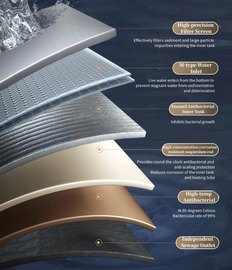 El sistema de calefacción de 3000W de eficiencia energética garantiza el agua caliente rápida mientras ahorra energía, complementado por una función de programación inteligente para el uso personalizado. Su tanque interno del esmalte aumenta la durabilidad, y el diseño a prueba de fugas + pared anti-electricidad garantiza la seguridad final.