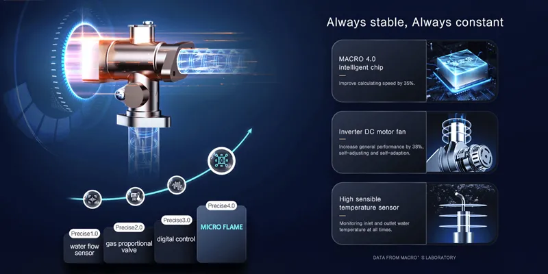 Integrado con 3 componentes de control de núcleo, realice una coincidencia óptima de gas y agua, con precisión de control estático y dinámico, mantenga el agua caliente siempre estable.