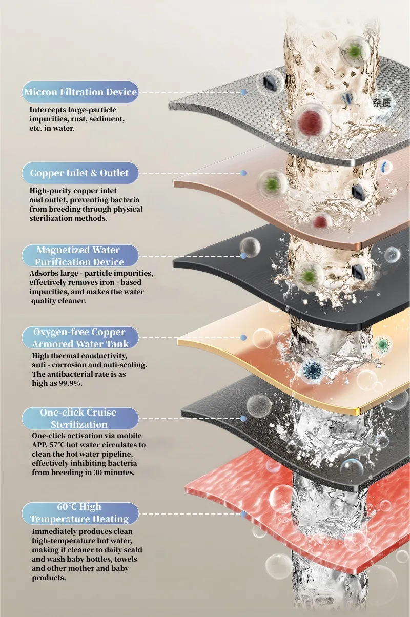 El calentador de agua de gas inteligente Z6L redefine la comodidad del baño con purificación de vanguardia y tecnologías inteligentes de control de temperatura. Con un sistema de cuidado de la piel de purificación magnética, elimina efectivamente el óxido, el cloro y las impurezas al tiempo que elimina las bacterias para una piel más saludable. La protección antibacteriana de 6 capas garantiza que cada ducha nutre su piel.