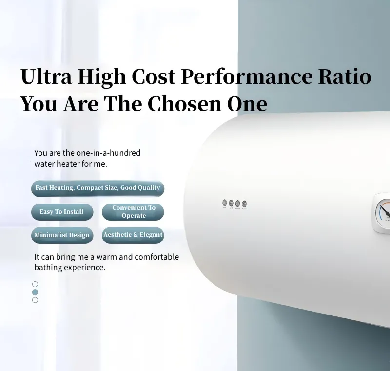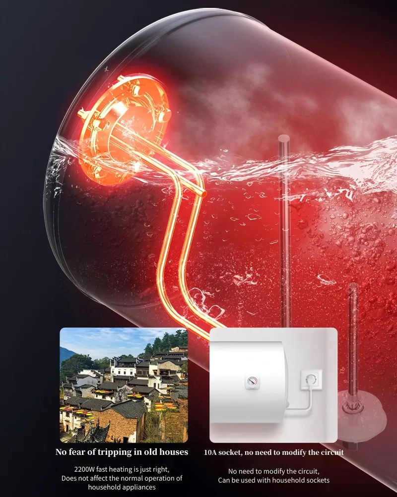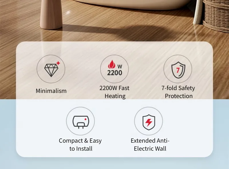 "Para una vida de ritmo rápido, elija el calentador de agua de calentamiento rápido de 2200 W". Menos espera, más cuidado.