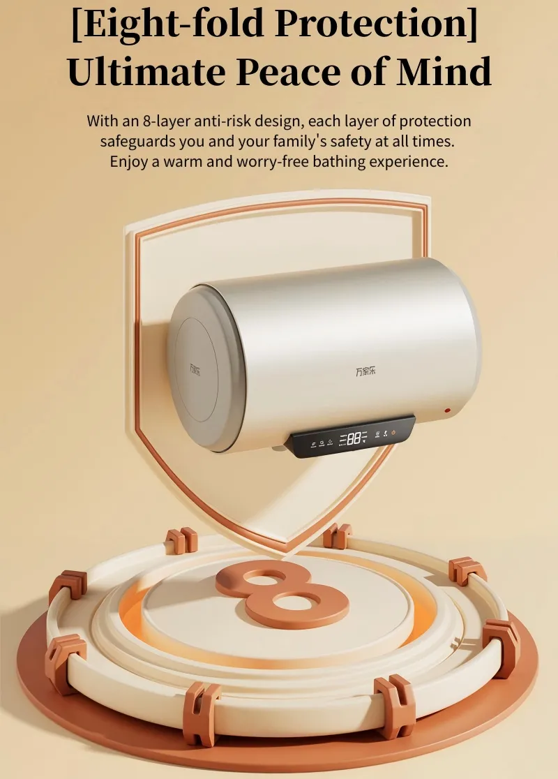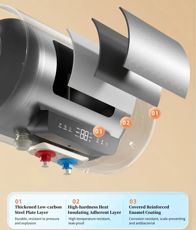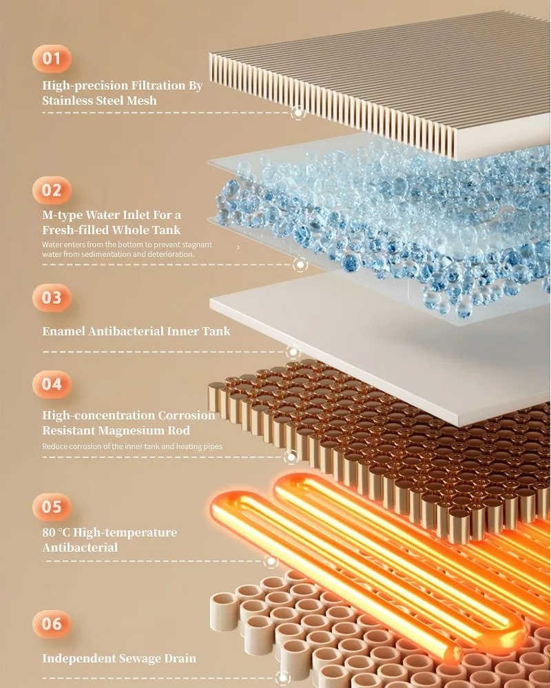 El sistema de purificación de 6 etapas (varilla de magnesio de alta densidad, tanque de esmalte, esterilización de alta temperatura 99.99%, etc.) asegura agua limpia y saludable. Sus 8 protecciones de seguridad (anticongelante, prevención de quemaduras secas, resistencia al rayo, etc.) y el tanque duradero de esmalte ofrecen confiabilidad a largo plazo.