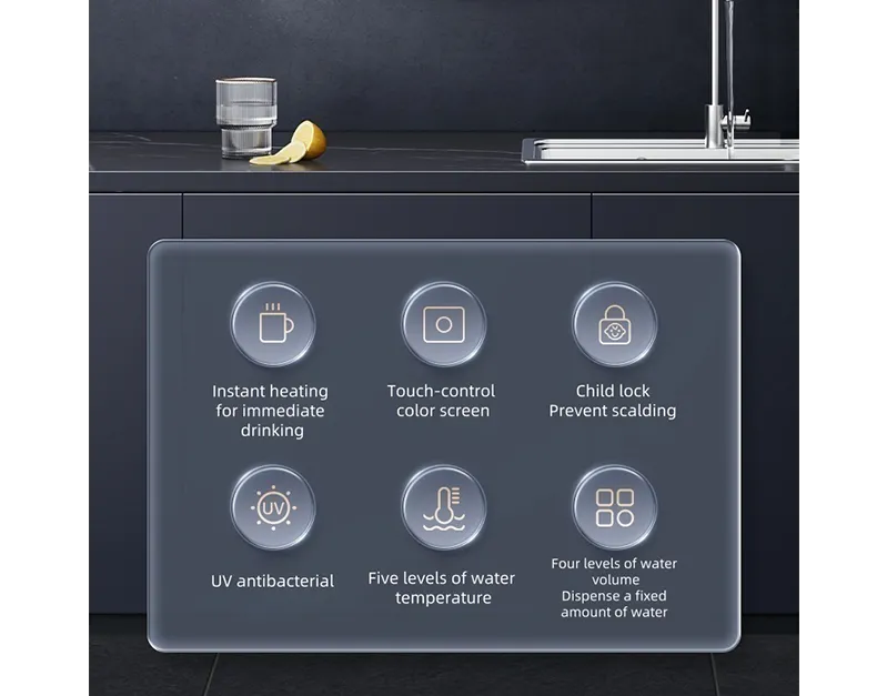 Este dispensador de agua premium presenta un elegante panel de vidrio templado con control táctil sensible y botones personalizados para la operación personalizada. El potente sistema de calentamiento de 2200W ofrece agua caliente instantánea en solo 3 segundos, ofreciendo múltiples opciones de temperatura: temperatura ambiente, 45 ° C, 80 ° C, 90 ° C y hirviendo 100 ° C.