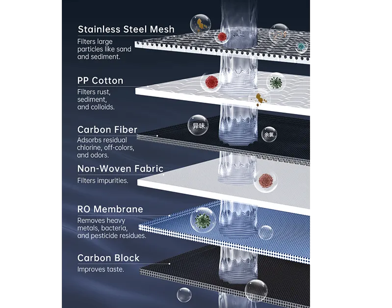 Combina la membrana RO con carbono post-octivado para la filtración precisa de bacterias y metales pesados.