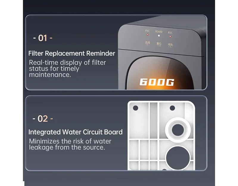Este purificador de agua Ro combina tecnología de vanguardia con un diseño fácil de usar. Con control táctil y un indicador de vida del filtro, garantiza un funcionamiento conveniente y un mantenimiento oportuno. El sistema incluye protección de tiempo de espera y función automática para una mayor seguridad y longevidad.