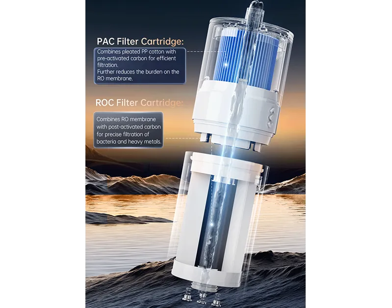 El cartucho de filtro 2 en 1 incluye un filtro PAC (vida útil de 12 meses) y la membrana Ro (vida útil de 36 meses), asegurando la purificación duradera.