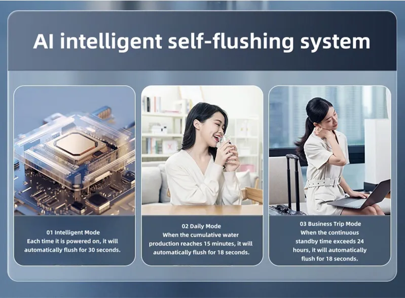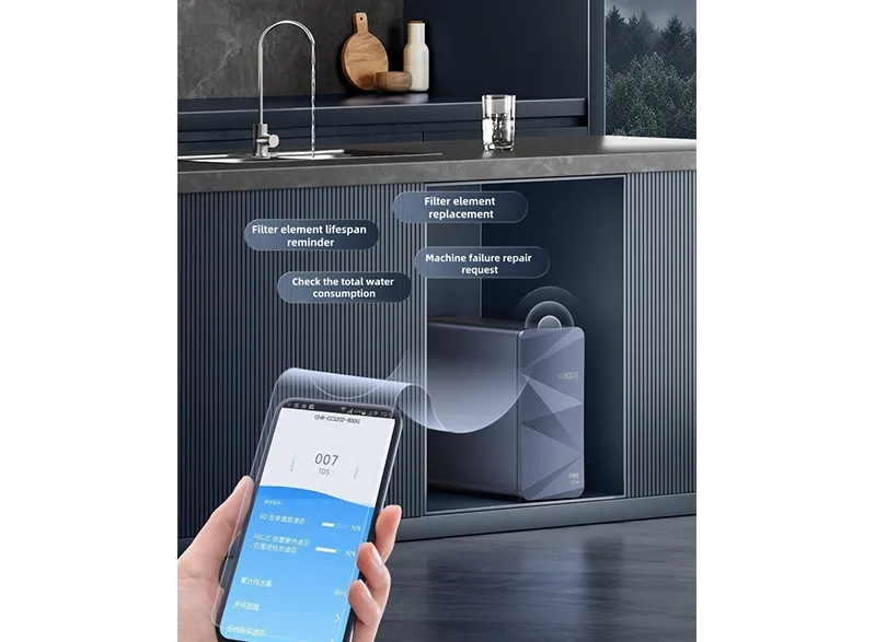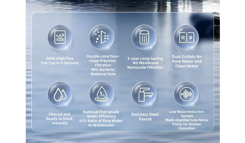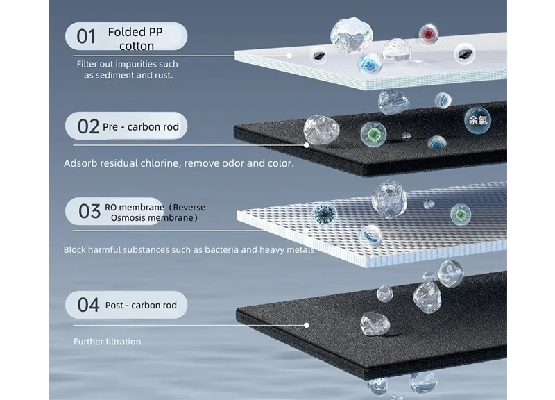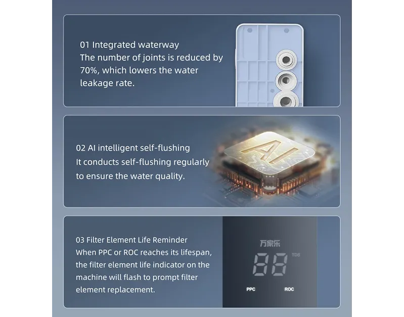 Adopta un sistema de filtración profunda de cuatro etapas de doble núcleos PPC+ ROC, que puede filtrar efectivamente las sustancias superiores como la escala de agua, el cloro residual y los metales pesados en el agua del grifo.
