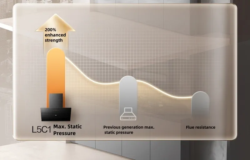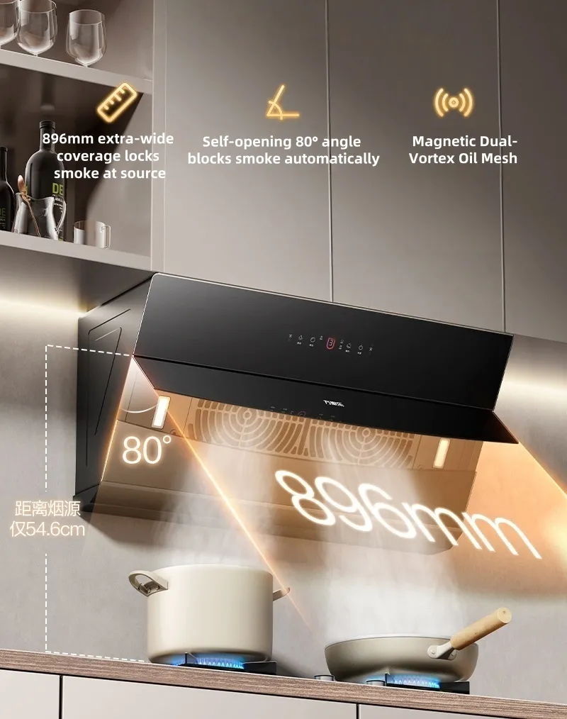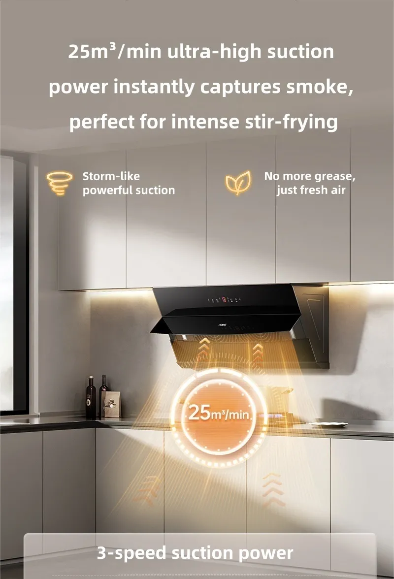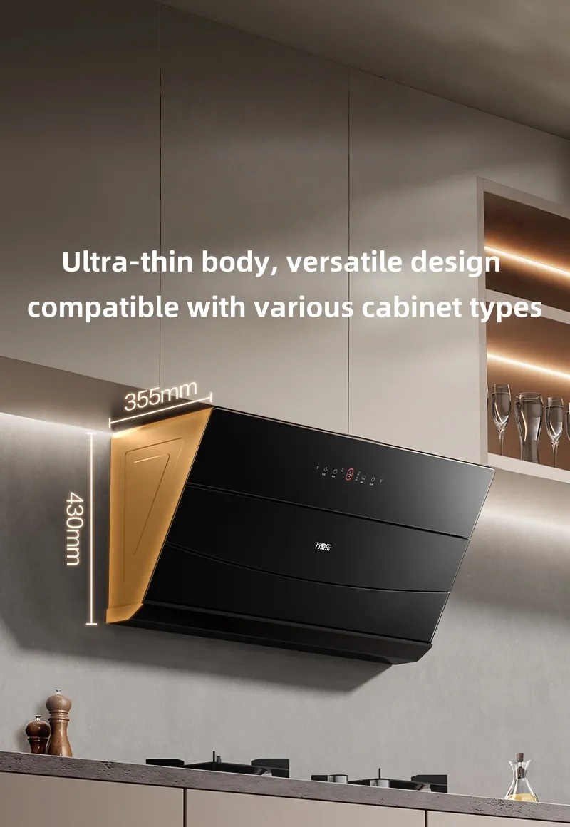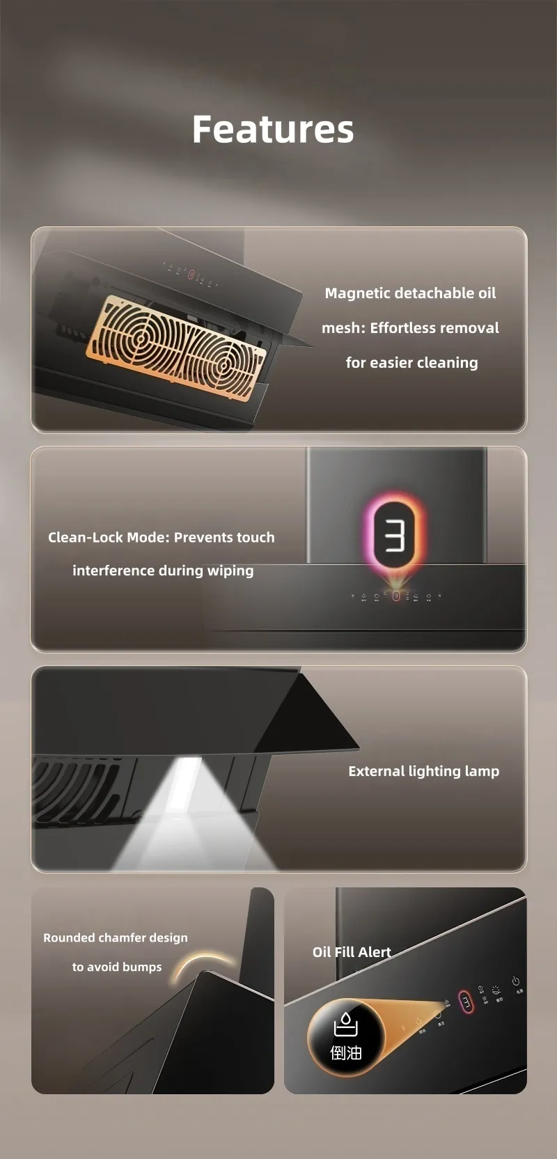 Esta campana de rango cuenta con 25m³ de alto volumen de aire, presión estática de 500pa y una barrera de humo de 896 mm para una absorción de humo eficiente. Con un enlace inteligente, un impulsor nano recubierto y una pantalla de aceite magnético, es fácil de limpiar. Ultra-Cuet (47dB), ahorro de espacio (355 mm de profundidad) y seguro con diseño redondeado. Una taza de aceite de 1.85L reduce la molestia.