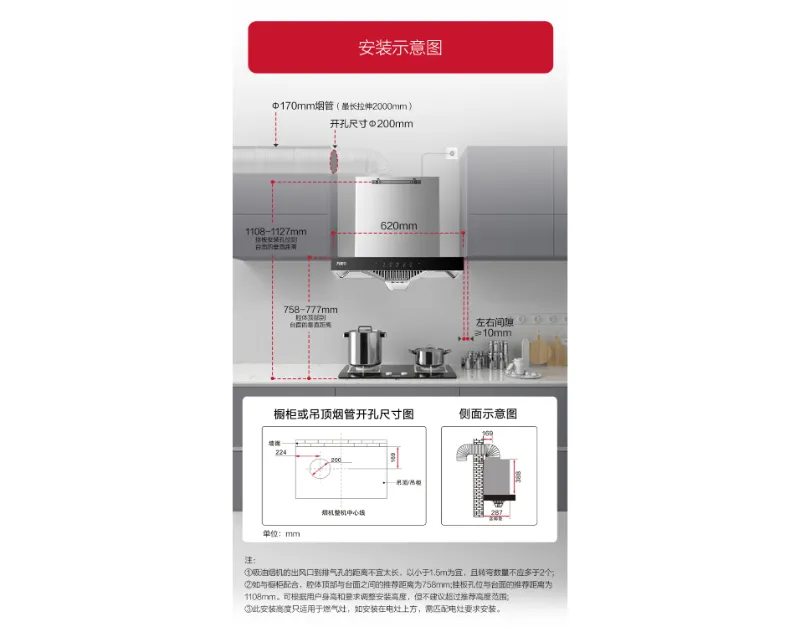 Cuando se combina con el gabinete, la distancia recomendada entre la parte superior de la carcasa y la encimera es de 758 mm; La distancia recomendada desde la posición del orificio de montaje hasta la encimera es de 1108 mm. La altura de la instalación se puede ajustar de acuerdo con la altura y los requisitos del usuario, pero no se recomienda exceder el rango de altura recomendado.